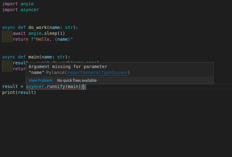 asyncer.runnify() takes the async function you want to call, and then it returns another function that takes the positional and keyword arguments needed, in this case it's just name="World".